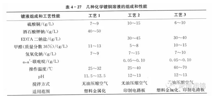 值得肯定的是,經過不斷的努力,人們發明了一些高速穩定的化學鍍銅新工藝,溶液 可以連續使用幾個月以上,并逐步實現了對鍍液的自動控制和調整。幾種較穩定的化學鍍銅溶液的組成和性能比較見表4-27,其中的酒石酸鉀鈉、EDTA二鈉鹽為配位劑,它使銅離子在堿性條件下的溶液中不形成Cu(OH)2沉淀; α ,α'-聯吡啶等是溶液的穩定劑,只需極少量即可有效地抑制氧化銅的生成和氧化亞銅的進一步還原。