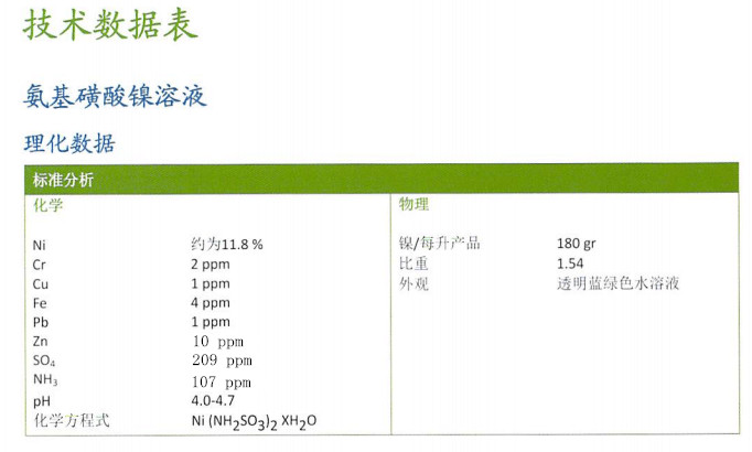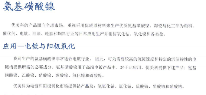 作 用:優美科氨基磺酸鎳具有較高的沉淀速度和特定的沉淀特性,適應于陶瓷與化工部為顏料、催化劑、電鍍、油漆、輪胎和飼料行業等日常應用生產。