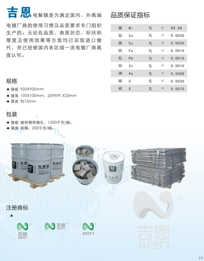 產(chǎn)品介紹:吉恩4*4鎳板厚度約18mm,邊緣較薄,可用于五金塑膠電鍍,為市場(chǎng)上高端品牌,純度高,品質(zhì)穩(wěn)定。