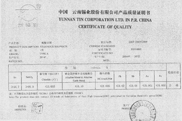 作 用:云南硫酸亞錫純度高,雜質少,鉛含量低,主要用于硫酸鹽鍍錫作主鹽使用,印染工業的媒染劑、雙氧水去除劑等。