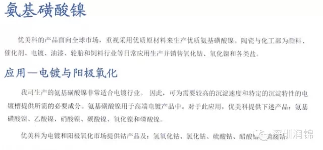 優美科氨基磺酸鎳具有較高的沉淀速度和特定的沉淀特性,適應于陶瓷與化工部為顏料、催化劑、電鍍、油漆、輪胎和飼料行業等日常應用生產。